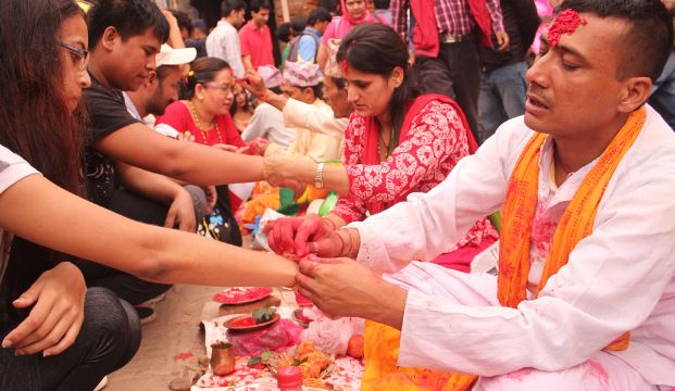 मानव रक्षाका लागि जप, तप र पूजा गरी मन्त्रिएको रक्षाबन्धन अर्थात् डोरो वैदिक परम्पराको मन्त्रोच्चारण गर्दै ब्राह्मण पुरोहितले यजमानको दाहिने नाडीमा बाँधिदिने गरिन्छ ।