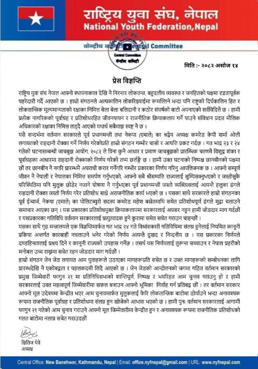काठमाडौं, १४ असोज । नेकपा (एमाले) निकट राष्ट्रिय युवा संघ नेपालले सरकारलाई आगामी प्रतिनिधिसभा निर्वाचन शान्तिपूर्ण, निष्पक्ष र भयरहित वातावरणमा सम्पन्न गर्न पूर्ण रूपमा केन्द्रित हुन आग्रह गरेको छ। संघका अध्यक्ष क्षितिज थेबेले मंगलबार जारी गरेको प्रेस विज्ञप्तिमा संगठनले सरकारलाई उक्त जिम्मेवारीमा सफल बनाउन तयार रहेको उल्लेख गर्दै राजनीतिक प्रतिशोधका गतिविधि तत्काल रोक्न चेतावनी दिएको छ।