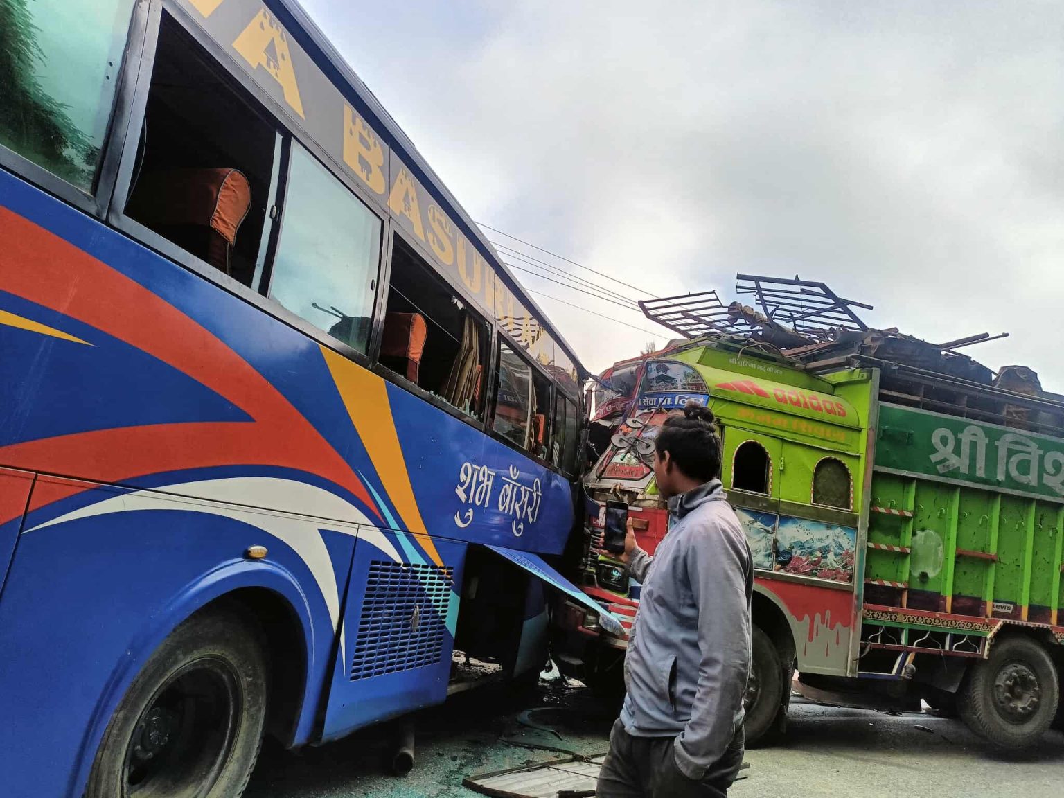 मुग्लिङबाट नारायणगढतर्फ आउँदै गरेको ना८ख ६६२९ नम्बरको ट्रक र विपरीत तर्फबाट जाँदै गरेको बा४ख ७४२० नम्बरको बस, बसको पछाडि ना७ख ९६०७ नम्बरको टेलर, त्यस पछाडि बा प्र ०६–००१ ग ०४८४ नम्बरको इलेक्टिक माइक्रो, त्यस पछाडि ग२ख १६२६ नम्बरको बस, त्यस पछाडि ना३च ३२५६ नम्बरको बलेरो, त्यस पछाडि बिएबी ८४७० नम्बरको कार ठक्कर खाएका हुन् ।
