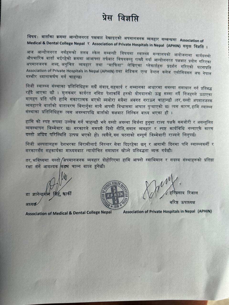 विज्ञप्तिमा भनिएको छ,  आज आन्दोलनरत नर्सहरूको तलब स्केल सम्बन्धी विषयमा स्वास्थ्य मन्त्रालयको आयोजनामा कार्यदलको औपचारिक बार्ता भईरहेको क्रममा आआफ्ना तर्फबाट विषयवस्तु राख्दै गर्दा आन्दोलनरत पक्षबाट प्रयोग गरिएका अपमानजनक शब्द, अनुचित व्यवहार तथा “माफिया” लेखिएका प्लेकार्डहरू प्रदर्शन गरिएको घटनाप्रति Association of Private Hospitals in Nepal (APHIN) तथा मेडिकल एन्ड डेन्टल कलेज एसोसियसन अफ नेपाल गम्भीर ध्यानाकर्षण गर्न चाहन्छ ।