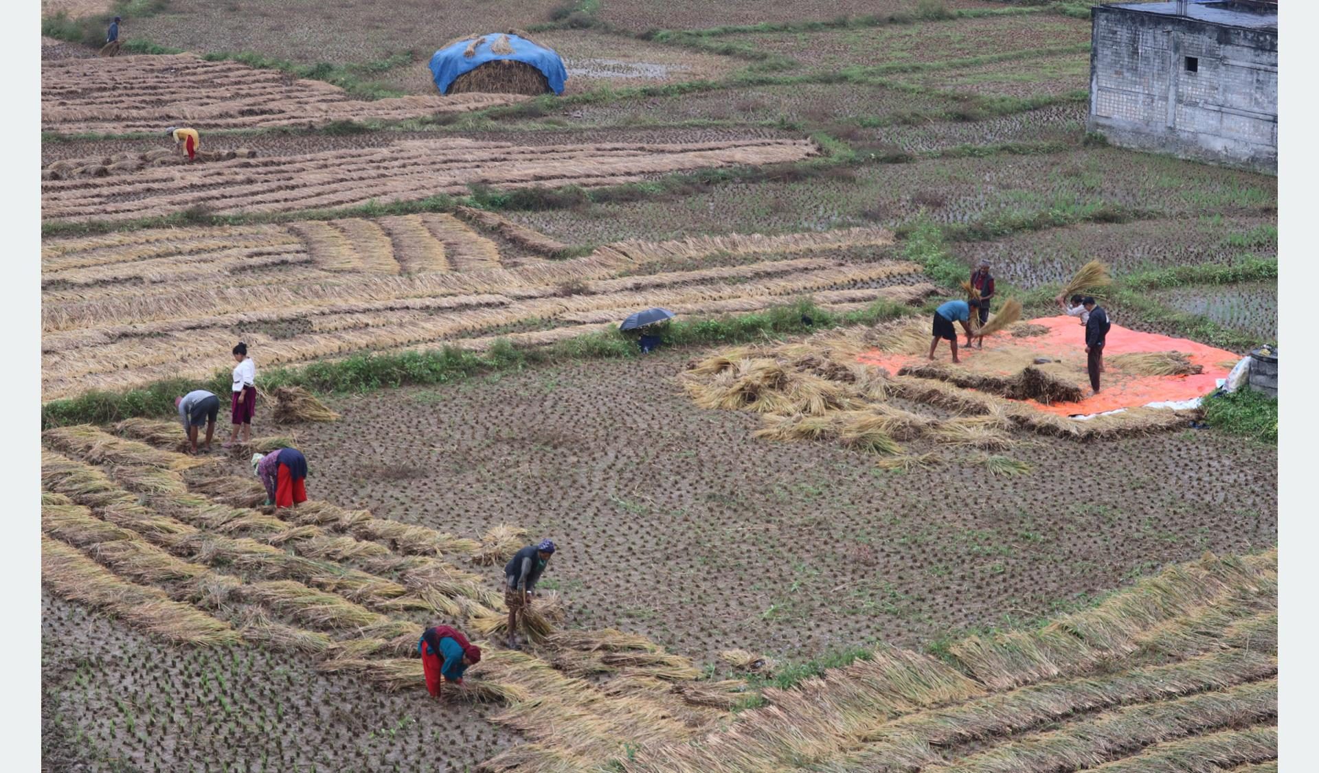 त्रिशूली (नुवाकोट), ११ कात्तिक । यहाँका किसान धानबाली भित्र्याउन व्यस्त देखिएका छन् । लगातारको सिमसिमे वर्षाका बीच पनि आज किसान धान काट्ने, चुट्ने र भित्र्याउने काममा जुटिरहेका छन् । चाडपर्वका कारण पाकिसकेको धान समयमा नै भित्र्याउन नपाउँदा बाला झुरिएर झर्ने अवस्था देखिएको र अझ ढिला गर्दा थप क्षति हुने चिन्ताले किसान वर्षालाई बेवास्ता गर्दै हतार–हतार धान भित्र्याउन व्यस्त भएका छन् । कतिपय ठाउँमा काटिसकेको धान सुरक्षित गर्न समस्या भएको छभने भिजेको धान चिसोका कारण बिग्रनसक्ने भन्दै किसानले चिन्ता जनाएका छन् ।
