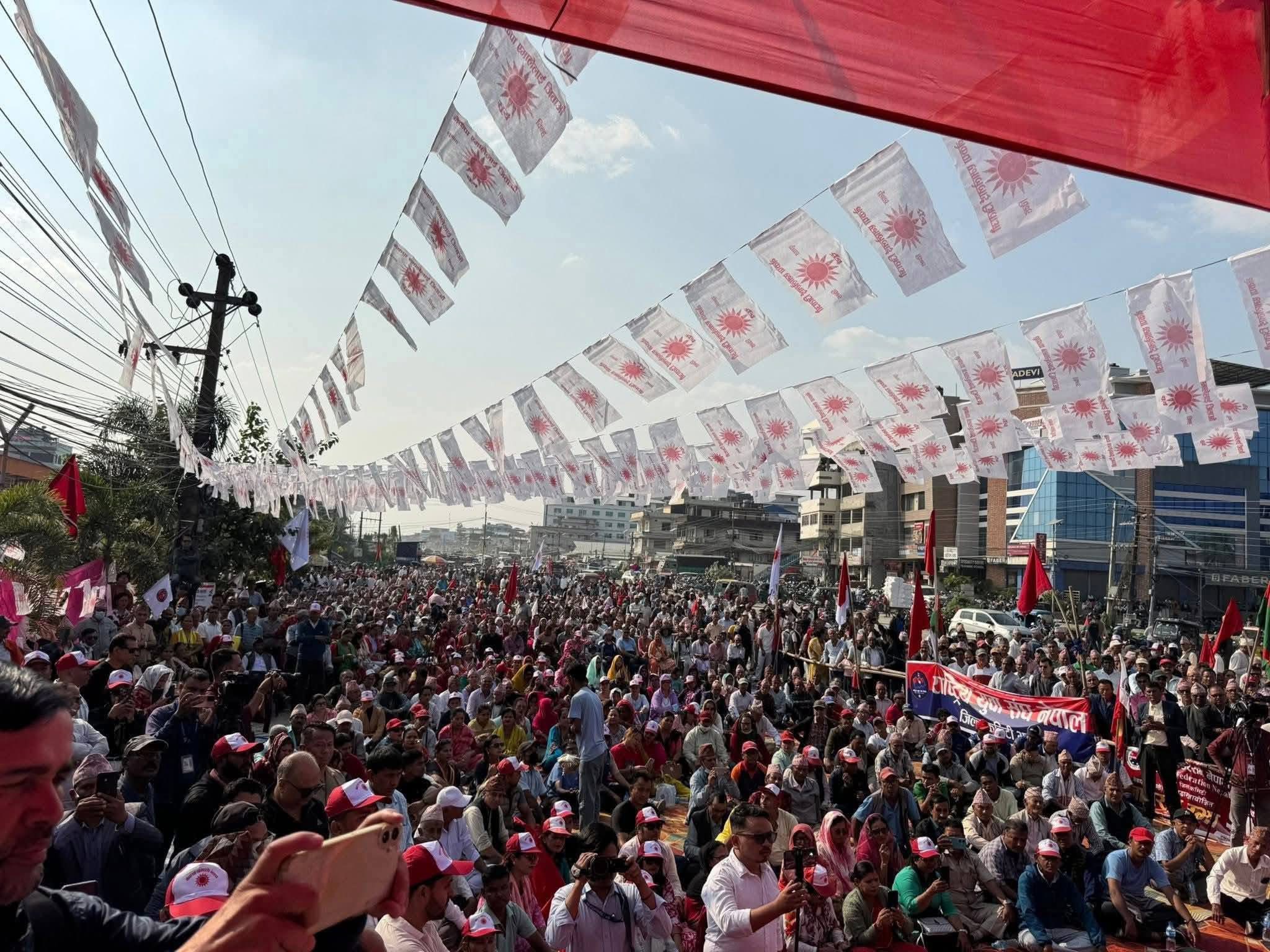 काठमाडौं, २९ कात्तिक। संसद् पुनस्र्थापना र सर्वपक्षीय सरकार माग्दै एमालेले आज देशभर शक्ति प्रदर्शन गरेको छ। संसद् विघटन र सरकार गठनलाई ‘प्रतिगामी षडयन्त्र’ भन्दै एमालेले जनपरिचालनसहित जिल्लाका सदरमुकाम र ठूला शहरमा जनसभा गरेको हो। सभाका लागि नेपालगन्ज पुग्नुभएका महासचिव शंकर पोखरेलले एमाले सङ्कटबाट नभागी त्यसको सामना गर्ने बताउनुभयो।