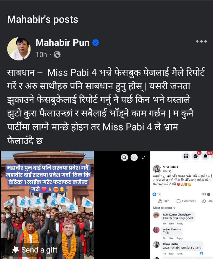 सावधान ः(Miss Pabi 4) भन्ने फेसबुक पेजलाई मैले रिपोर्ट गरेँ र अरू साथीहरू पनि सावधान हुनुहोस्, स्क्रिनसटसहित पुनले सामाजिक सञ्जालमा लेख्नुभएको छ, यसरी जनता झुक्याउने फेसबुकेलाई रिपोर्ट गर्नु नै पर्छस किनभने यस्ताले झुटो कुरा फैलाउँछन् र सबैलाई भाँड्ने काम गर्छन्। म कुनै पार्टीमा लाग्ने मान्छे होइन, तर(Miss Pabi 4) ले भ्रम फैलाउँदै छ।