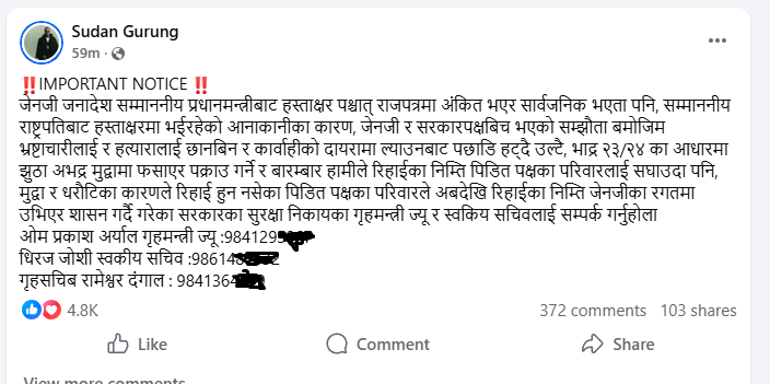 काठमाडौँ, ६ पुस । द काउन्सिल अफ जेन जेडका संयोजक सुदन गुरुङले सरकारले सम्झौता भएपनि प्रहरीले जेनजी आन्दोलनका सहभागीविरुद्ध मुद्दा चलाउनेक्रम नरोकेको भन्दै गृहमन्त्रीको मोबाइल नम्बर सार्वजनिक गर्नुभएको छ। गुरुङले भदौ २३ र २४ को आन्दोलनमा पक्राउ परेका परिवारले गृहमन्त्री ओमप्रकाश अर्याल, गृहसचिव रामेश्वर दंगाल र सचिव धिरज जोशीलाई सम्पर्क गर्न मोबाइल नम्बर सार्वजनिक गर्नुभएको छ।सरकारले जेनजी आन्दोलनलाई जनआन्दोलनको मान्यता दिइसकेको र सम्झौतामा प्रदर्शनमा सहभागीलाई फौजदारी मुद्दा नचलाउने उल्लेख भएपनि आन्दोलनकारीलाई झुटा मुद्दा लगाइएको गुरुङले आरोप लगाउनुभएको छ।