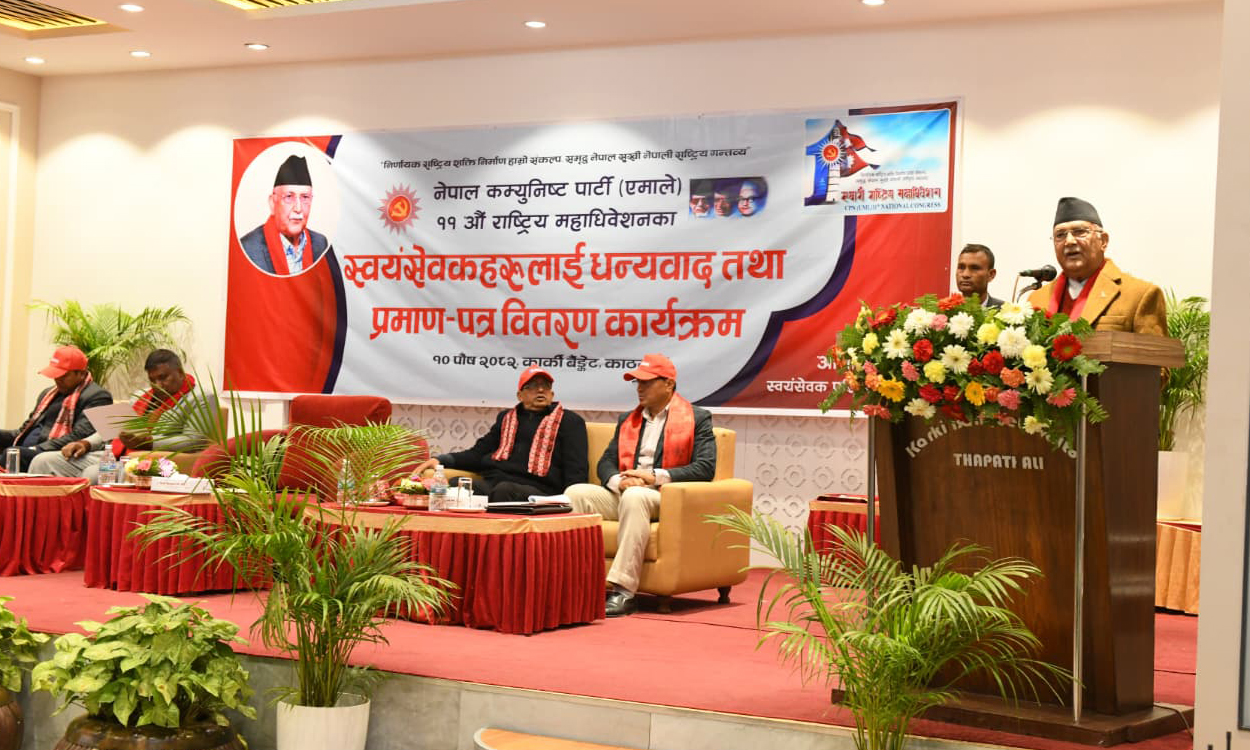काठमाडौं, १० पुस । नेकपा (एमाले) का अध्यक्ष केपी शर्मा ओलीले जनताका गएर बहुमत ल्याउन एमाले तयार रहेको बताउनुभएको छ। राष्ट्रिय महाधिवेशनमा खटिएका स्वयंसेवकहरुलाई सम्मान र प्रमाणपत्र वितरण गन आज आयोजित कार्यक्रमलाई सम्बोधन गर्दै पूर्व प्रधानमन्त्री ओलीले आफूहरू प्रतिनिधिसभाको पुनःस्थापनाको पक्षमा रहे पनि शान्तिपूर्ण वातावरणमा चुनाव हुने भने त्यसको सामना गर्न तयार रहेको बताउनुभएको हो ।