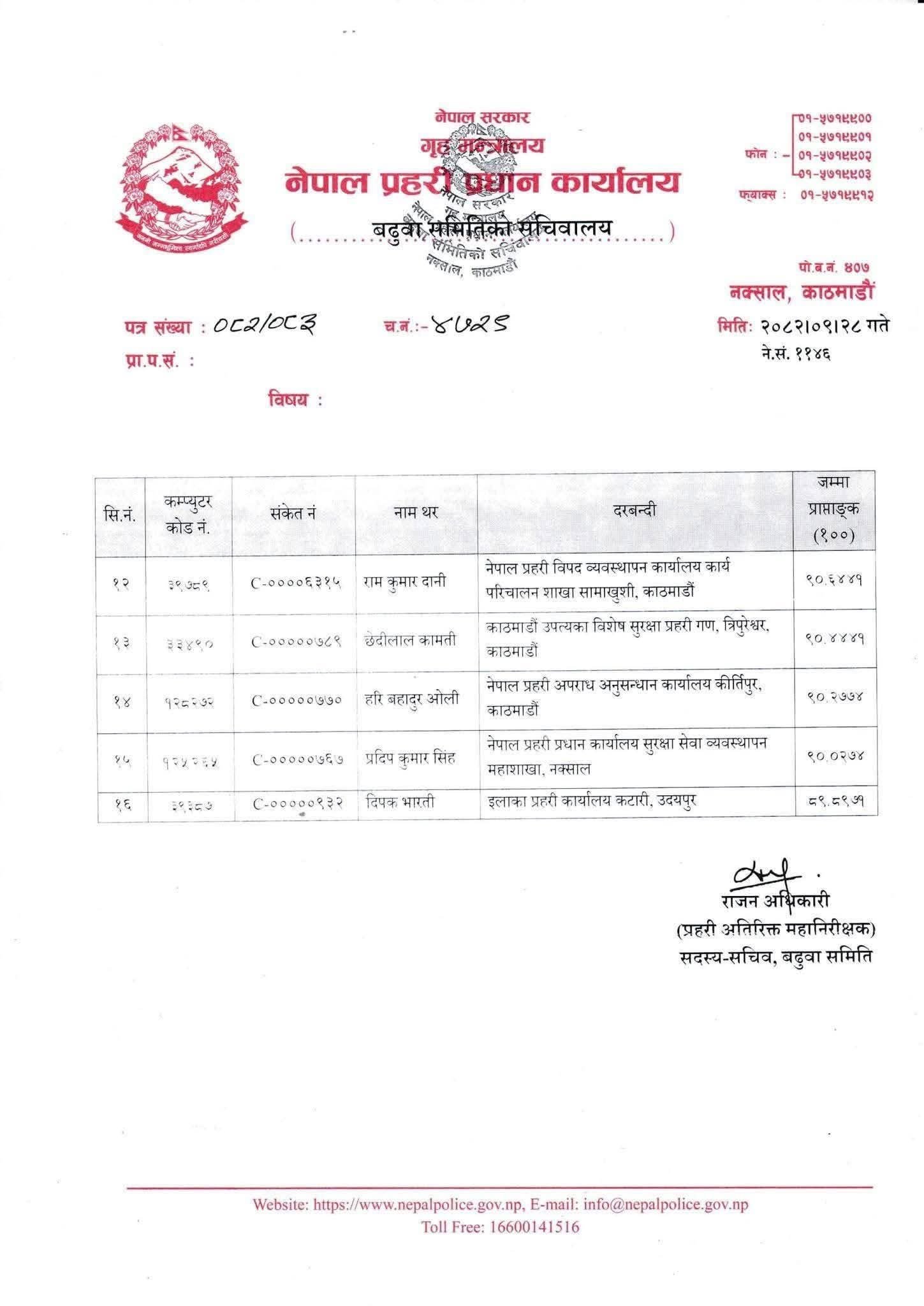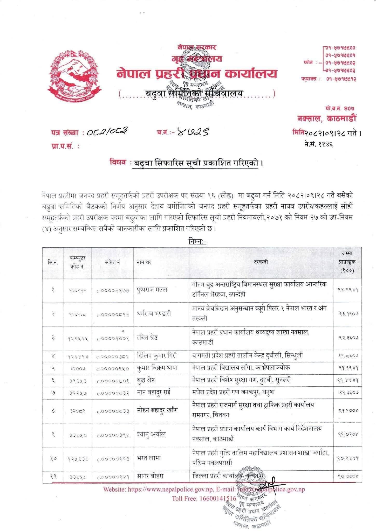 बढुवा सिफारिस हुने सूचीको पहिलो नम्बरमा डीएसपी पुष्पराज मल्ल छन् । डिएसपीहरू धर्मराज भण्डारी, रबिन श्रेष्ठ, दिलिप कुमार गिरी, कुमार विक्रम थापा, बुद्ध श्रेष्ठ, मान बहादुर राई, मोहन बहादुर खाण, श्यामु अर्याल, भरत लामा, सागर बोहरा, रामकुमार दानी र छेदीलाल कामती लाई बढुवा सिफारिस गरिएको छ ।त्यस्तै हरि बहादुर ओली, प्रदीप कुमार सिंह र दिपक भारतीलाई एसपीमा बढुवा गर्न सिफारिस गरिएको प्रहरी प्रधान कार्यालयले जनाएको छ ।