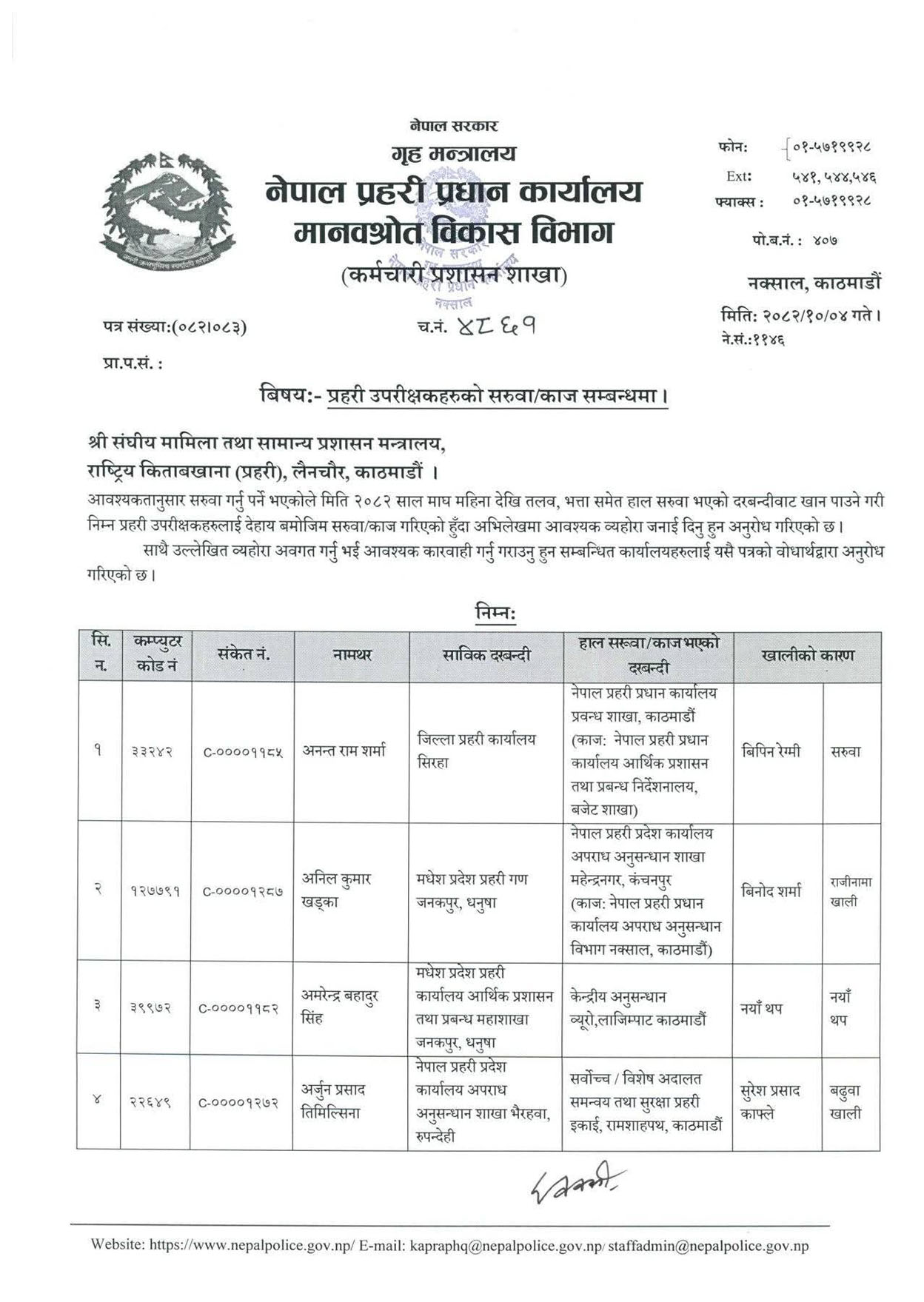 गौतम मिश्रलाई सुदूरपश्चिम प्रदेश प्रहरी कार्यालयको आर्थिक प्रशासन महाशाखाबाट जिल्ला प्रहरी परिसर ललितपुर ल्याइएको छ । ललितपुरका प्रहरी प्रमुख चक्रराज जोशीलाई नेपाल प्रहरीको केन्द्रीय विशेष कार्यदलमा पठाइएको छ ।चुनावको हटस्पट मानिएको झापामा बसुन्धरा खड्कालाई लगिएको छ । उहाँ बागमती प्रदेश मानव श्रोत व्यवस्थापन महाशाखा हेटौँडामा हुनुहुन्थ्यो ।नेपाल प्रहरीले ८ जना डीआईजीको पनि सरुवा गरेको छ ।