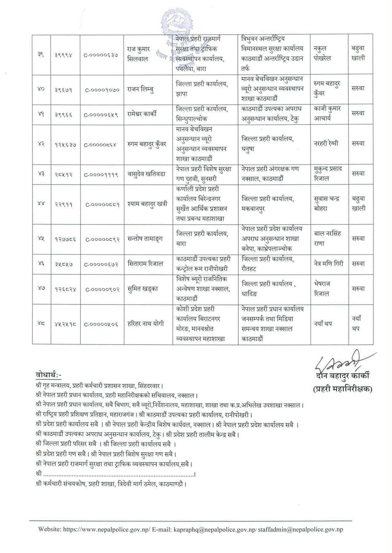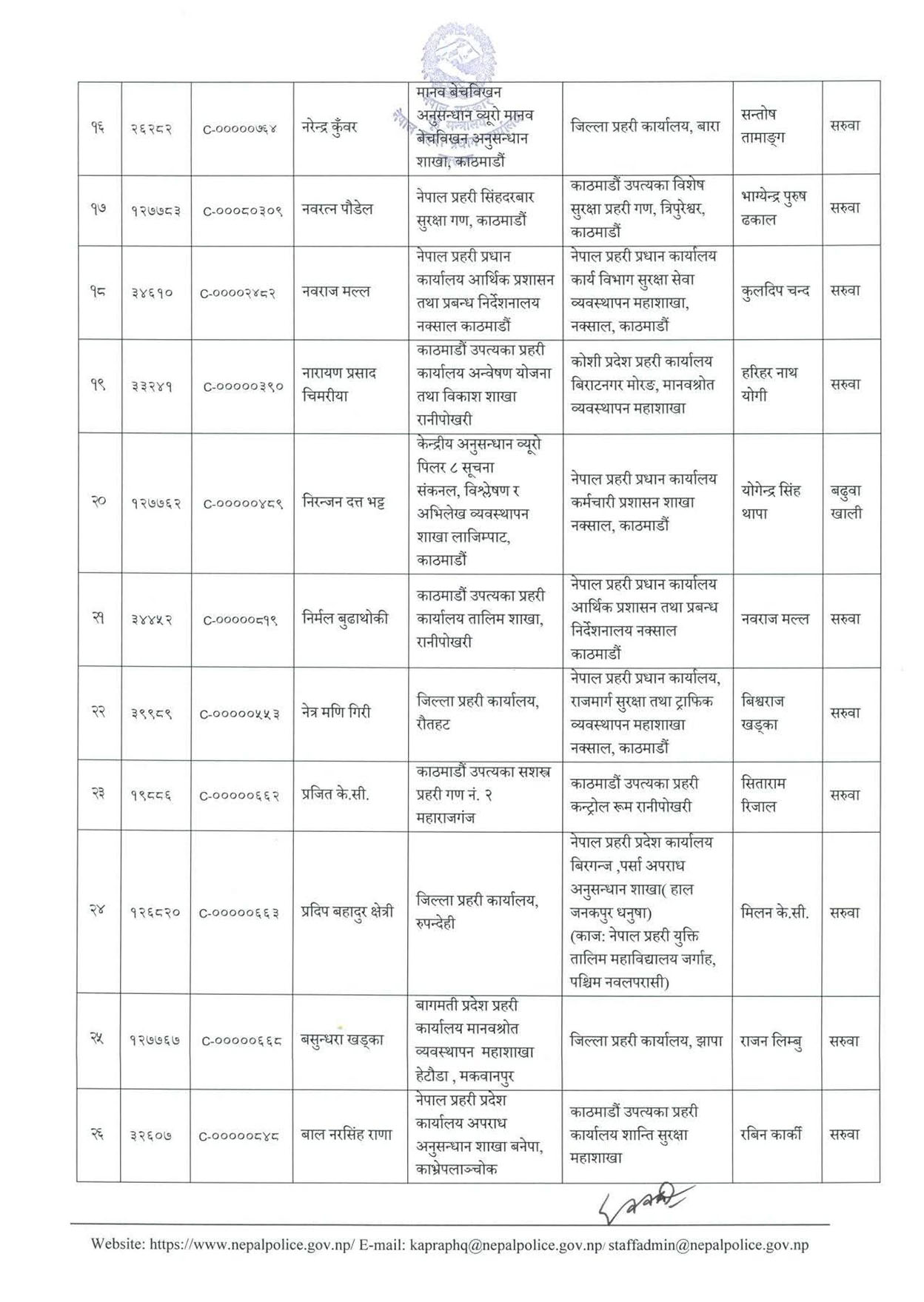 गौतम मिश्रलाई सुदूरपश्चिम प्रदेश प्रहरी कार्यालयको आर्थिक प्रशासन महाशाखाबाट जिल्ला प्रहरी परिसर ललितपुर ल्याइएको छ । ललितपुरका प्रहरी प्रमुख चक्रराज जोशीलाई नेपाल प्रहरीको केन्द्रीय विशेष कार्यदलमा पठाइएको छ ।चुनावको हटस्पट मानिएको झापामा बसुन्धरा खड्कालाई लगिएको छ । उहाँ बागमती प्रदेश मानव श्रोत व्यवस्थापन महाशाखा हेटौँडामा हुनुहुन्थ्यो ।नेपाल प्रहरीले ८ जना डीआईजीको पनि सरुवा गरेको छ ।