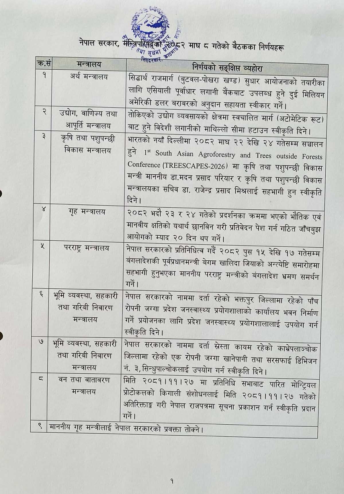 काठमाडौं, ९ माघ । सरकारले मन्त्रिपरिषद् बैठकका निर्णय सार्वजनिक गरेको छ ।