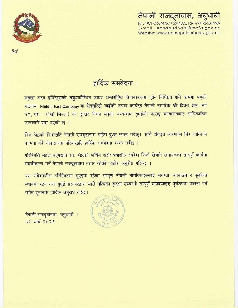 काठमाडौं, १८ फागुन । संयुक्त अरब इमिरेट्स (यूएई) को आबुधाबीमा इरानी ड्रोन आक्रमणमा परेर ज्यान गुमाउने नेपाली नागरिक गोरखाका दिवस श्रेष्ठ रहेका परराष्ट्र मन्त्रालयले जनाएको छ ।२९ वर्षका श्रेष्ठ सेक्युरिटी गार्डको काम गर्दै आउनुभएको थियो ।