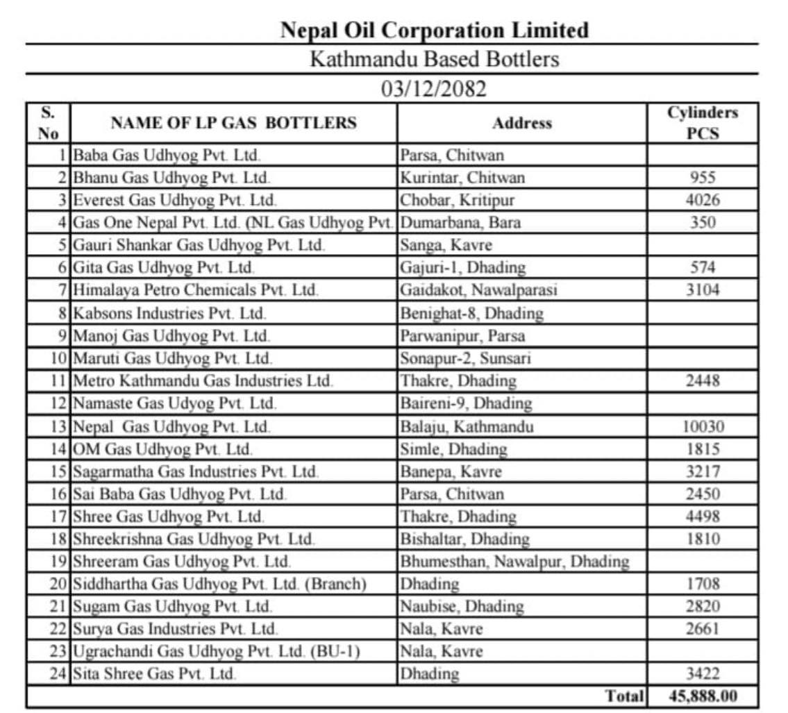 त्यसैगरी सुगम ग्यासले २ हजार ८२०, मेट्रो काठमाडौंले २ हजार ४४८, ओम ग्यासले १ हजार ८१५ र श्रीकृष्ण ग्यासले १ हजार ८१० थान सिलिन्डर बजारमा पठाएका छन् । हिमालय पेट्रो केमिकल्सले ३ हजार १०४ र साई बाबा ग्यासले २ हजार ४५० वटा सिलिन्डर आपूर्ति गरेका छन् ।