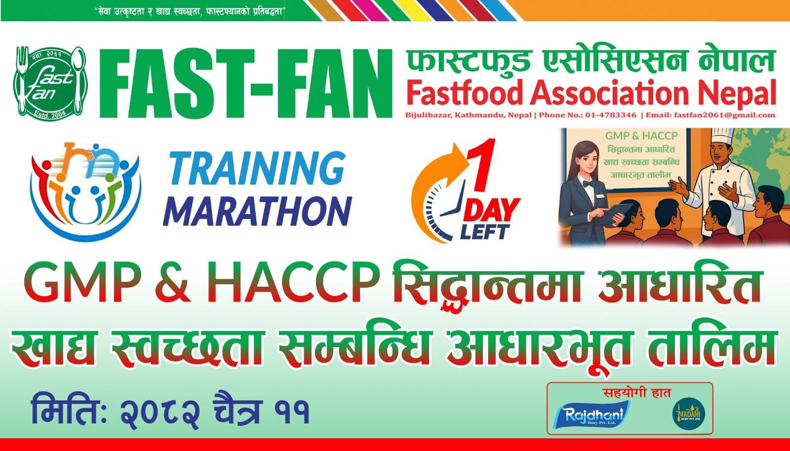 काठमाडौं,११ चैत्र ।  फास्ट फुड एसोसिएसन नेपाल (फास्ट फ्यान) ले सदस्य प्रतिनिधि, म्यानेजर, सेफ तथा क्याप्टेनलाई लक्षित गर्दै GMP/HACCP आधारित खाद्य स्वच्छता तथा सेवा उत्कृष्टता सम्बन्धी “Training Marathon” कार्यक्रम सुरु गरेको छ।