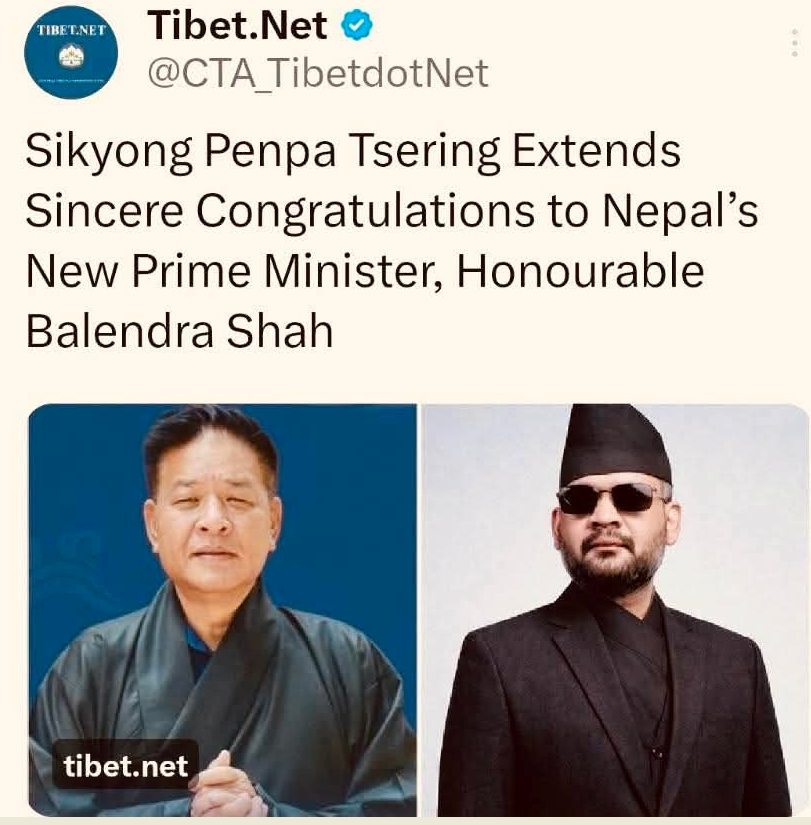 काठमाडौं, १५ चैत । तिब्बती निर्वासित सरकारका प्रमुख नेता पेम्पा छेरिङ ले नेपालका नवनिर्वाचित प्रधानमन्त्री बालेन्द्र शाह लाई बधाई तथा शुभकामना व्यक्त गर्नुभएको छ। केन्द्रीय तिब्बती प्रशासन र तिब्बती जनताको तर्फबाट उहाँले औपचारिक बधाई सन्देश पठाउनुभएको हो।
