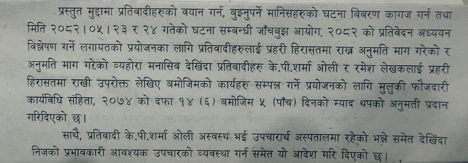 न्यायाधीश आनन्दप्रसाद श्रेष्ठ को इजलासले पाँच दिनको म्याद थपको अनुमति दिँदै यस्तो आदेश जारी गरेको हो। आदेशमा ओली अस्वस्थ भई अस्पतालमा उपचाररत रहेको देखिएकाले उहाँको आवश्यक उपचारको प्रभावकारी व्यवस्था गर्नुपर्ने उल्लेख गरिएको छ।