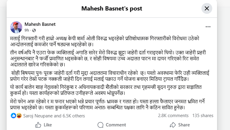 बस्नेतले सामाजिक सञ्जालमा लेखेका छन्, “म फरार भएको भन्ने प्रचार पूर्ण रूपमा भ्रम फैलाउने उद्देश्यले गरिएको हो। यो राजनीतिक रूपमा सिर्जित दुष्प्रचार बाहेक केही होइन।”