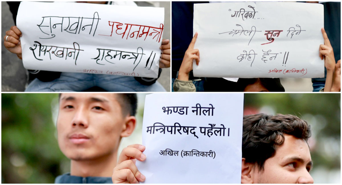 काठमाडौँ, ३० चैत्र । प्रधानमन्त्री बालेन शाह नेतृत्वको मन्त्रिपरिषद्का मन्त्रीहरूको सम्पत्तिको वैध स्रोत सार्वजनिक गर्न माग गर्दै विद्यार्थीहरूले काठमाडौँमा प्रदर्शन गरेका छन्। सोमबार अखिल क्रान्तिकारी ले माइतीघर मण्डला मा प्रदर्शन गर्दै मन्त्रीहरूले सार्वजनिक गर्नुभएको सम्पत्ति विवरणको स्रोत स्पष्ट रूपमा छानबिन गर्नुपर्ने माग गरेको हो।
