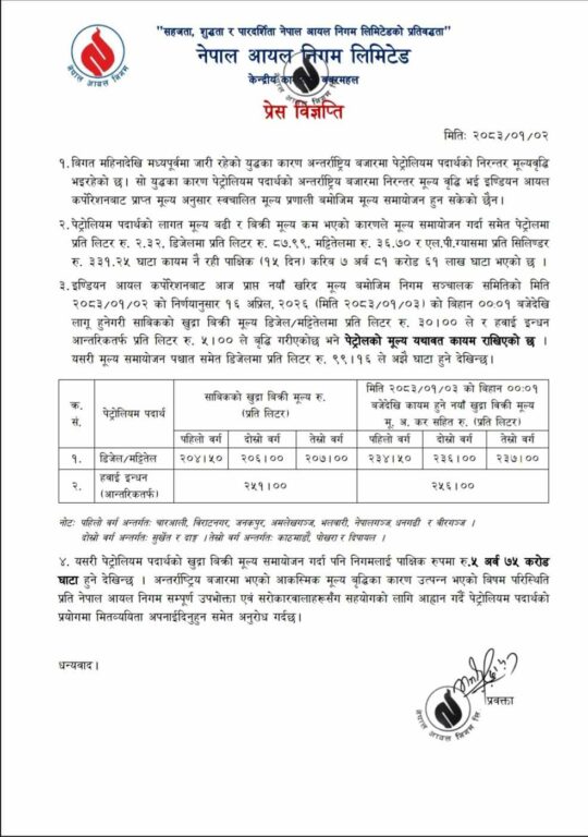 काठमाडौं, ३ वैशाख । नेपाल आयल निगमले डिजेल, मट्टीतेल तथा हवाइ इन्धन आन्तरिकतर्फको भाउ बढाएको छ । पेट्रोल र खाना पकाउने एलपी ग्यासको भाउ भने यथावत् छ । डिजेल र मट्टितेलको प्रतिलिटर ३० रुपैयाँ तथा हवाइ इन्धन आन्तरिकतर्फ प्रतिलिटर ५ रुपैयाँ भाउ बढेको हो । अब डिजेल र मट्टीतेलको भाउ पहिलो वर्गमा प्रतिलिटर २३४ रुपैयाँ ५० पैसा, दोस्रो वर्गमा २३६ रुपैयाँ र तेस्रो वर्गमा २३७ रुपैयाँ पुगेको छ । हवाई इन्धन आन्तरिकतर्फ प्रतिलिटर २५६ रुपैयाँ भएको छ ।