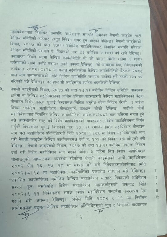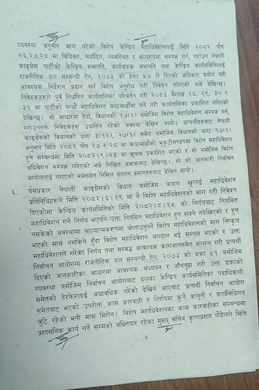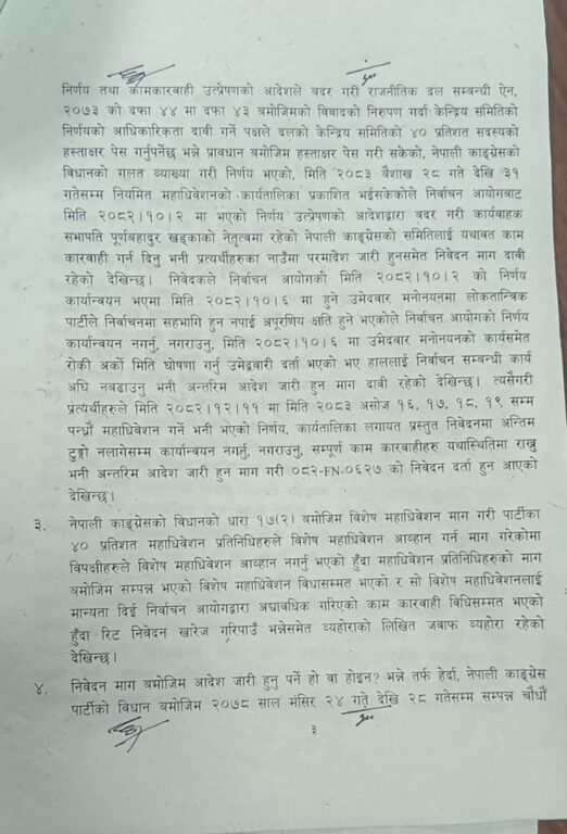 सर्वोच्चको संक्षिप्त आदेशमा देउवा पक्षले कारबाहीको विषयमा निर्वाचन आयोगलाई गराएको जानकारी र विशेष महाधिवेशनबारे दिएको उजुरी पत्रलाई राजनीतिक दलको ऐन दफा ४३ र ४४ अन्तर्गतको उजुरी मान्न नमिल्ने भएकाले कारबाही सदर हुन नसक्ने आशय उल्लेख गरेको हो ।यस्तै केन्द्रीय पदाधिकारीको हेरफर अद्यावधिक भएपछि गगन थापाको हस्ताक्षरबाट फागुन २१ को संघीय संसद्को निर्वाचन सम्पन्न भएको र त्यसले राजनीतिक वैधता प्राप्त गरेको सर्वोच्चको संक्षिप्त आदेशमा उल्लेख छ ।