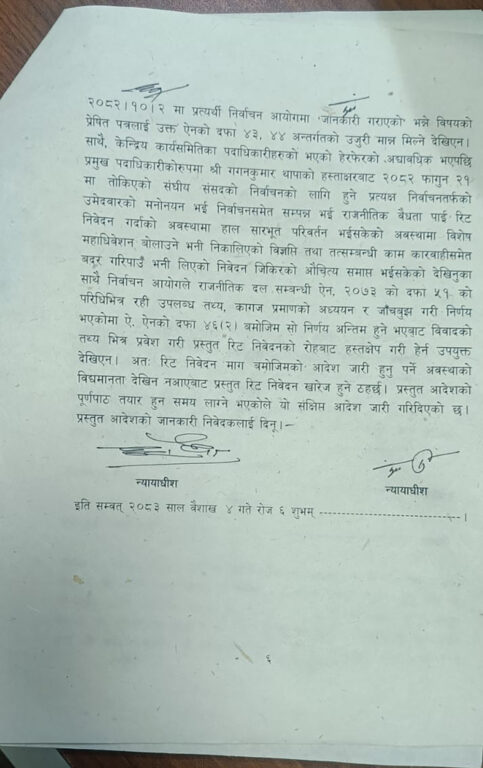 आदेशमा भनिएको छ, संघीय संसदको निर्वाचनका लागि हुने प्रत्यक्ष निर्वाचनतर्फको उमेदवारको मनोनयन भई निर्वाचनसमेत सम्पन्न भई राजनीतिक वैधता प्राप्त गरेपछि रिट निवेदन गर्दाको अवस्थामा सारभूत परिवर्तन भइसकेको अवस्थामा विशेष महाधिवेशन बोलाउने भनि निकालिएको वक्तव्यको औचित्य समाप्त भएको देखियो ।निर्वाचन आयोगले सम्पूर्ण कामकारबाही कानुनी आधारमै गरेकाले निवेदकको तर्फबाट हस्तक्षेपगरी हेर्न उपयुक्त नदेखिएको संक्षिप्त आदेशमा भनिएको छ ।