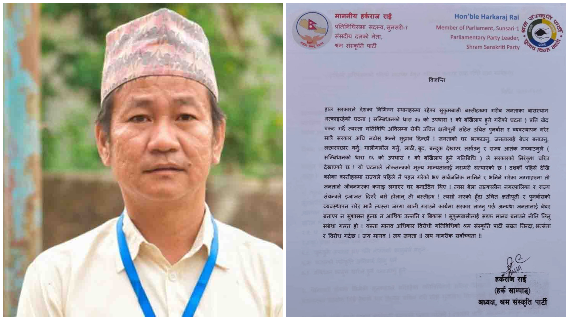 काठमाडौँ, ११ वैशाख । सरकारले देशका विभिन्न स्थानमा सुकुमवासी बस्ती हटाउने कार्य अघि बढाएकोप्रति श्रम संस्कृति पार्टीका अध्यक्ष हर्क साम्पाङले कडा आपत्ति जनाउनुभएको छ।
