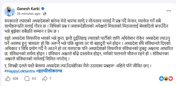 उहाँले अध्यादेश ल्याउने संवैधानिक अधिकार रहेको स्वीकार गर्दै पनि यसपटक संविधानको मर्मअनुसार व्यवहार नभएको धारणा व्यक्त गर्नुभयो। “संविधान अक्षरमा मात्रै होइन, यसको मर्ममा आधारित भएर चल्नुपर्छ,” उहाँले भन्नुभयो।