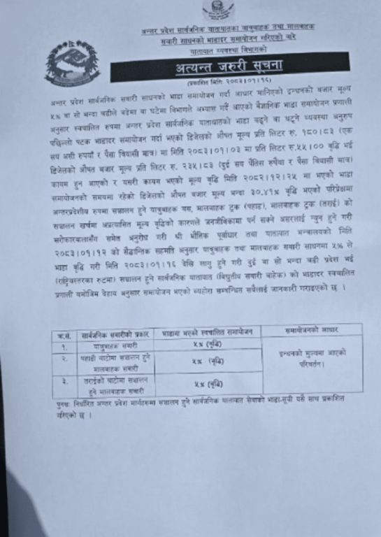 यस निर्णयअनुसार सार्वजनिक यात्रुवाहक गाडी, पहाडी क्षेत्रमा चल्ने मालवाहक सवारी तथा तराईका मालवाहक गाडीको भाडा समान दरमा बढाइएको छ ।