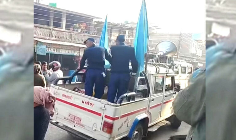 काठमाडौं, १८ फागुन । राष्ट्रिय स्वतन्त्र पार्टी (रास्वपा) को झन्डा राखेर चुनावी प्रचारमा हिँडेको जिपबाट