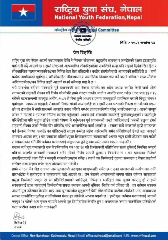 काठमाडौं, १४ असोज । नेकपा (एमाले) निकट राष्ट्रिय युवा संघ नेपालले सरकारलाई आगामी प्रतिनिधिसभा निर्वाचन