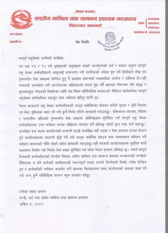 काठमाडौं, ९ असोज । काठमाडौं । केही सरकारी कर्मचारीले सार्वजनिक संस्थान र कार्यालयमा जेनजी नेपाल