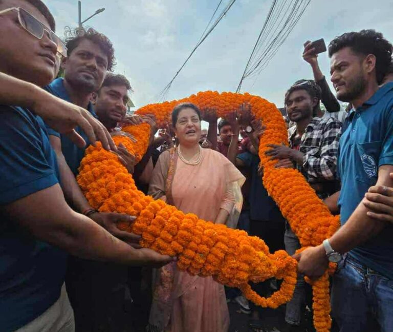 काठमाडौं, १४ भदौ । पूर्वराष्ट्रपति विद्यादेवी भण्डारीलाई नेकपा एमालेका कार्यकर्ताहरूले बारामा ५१ केजी फूलको मालाले