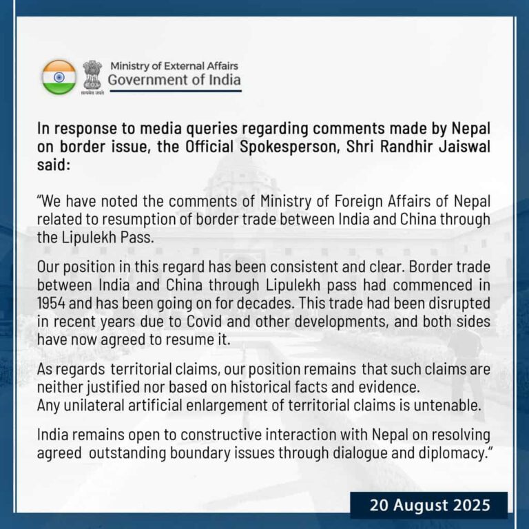 काठमाडौं, ५ भदौ । भारतको परराष्ट्र मन्त्रालयले लिपुलेकबाट भारतचीनबीच हुने सीमावर्ती व्यापार पुनः सुरु गर्ने