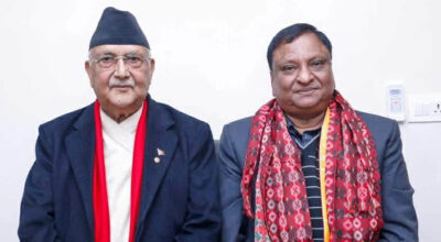 काठमाडौं, ३ माघ । नेपाली कांग्रेसका सभापति गगनकुमार थापा र निवर्तमान सभापति शेरबहादुर देउवाबीच भेटवार्ता भएको छ। महाराजगञ्जस्थित देउवा निवासमा उहाँहरूबीच भेटवार्ता भएको हो। भेटवार्तामा उपसभापति विश्वप्रकाश शर्मा पनि सहभागी हुनुहुन्थ्यो। कांग्रेस महामन्त्री गुरुराज घिमिरेले सभापति र निवर्तमान सभापतिबीच शिष्टाचार भेट भएको पुष्टि गर्नूभयो। उहाँहरूबीच शिष्टाचार भेटवार्ता भएको हो। सभापतिले निवर्तमान सभापतिलाई भेट्नु सामान्य कुरा…